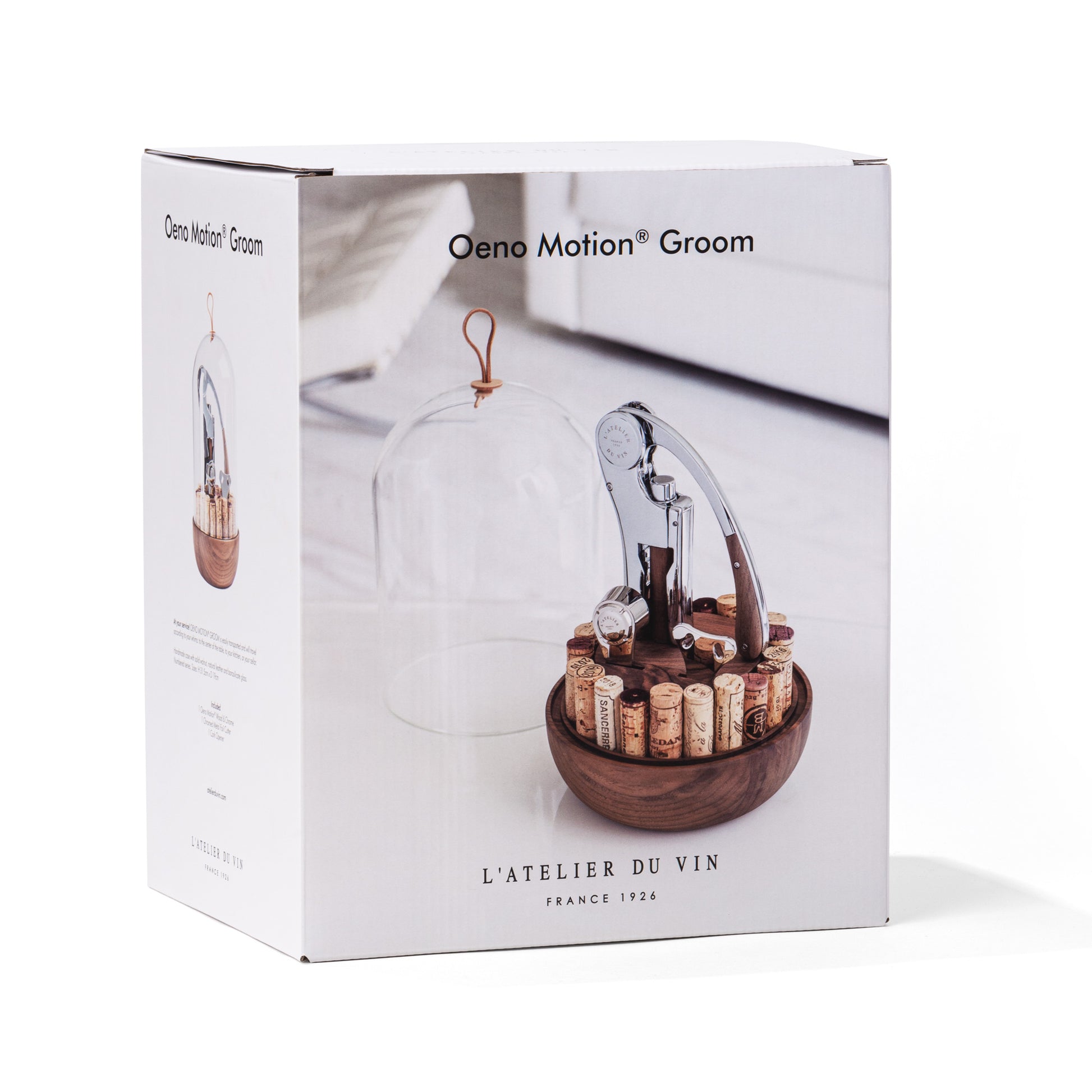 The Oeno Motion Groom brings together, under a glass globe, fitted with a real leather cord and a walnut base cut from standing wood, the iconic Wine Tools of L'Atelier du Vin: the Oeno Motion Wood & Chrome , the reference corkscrew with vertical lever, the Cork Tongs for delicately opening champagnes and fine sparkling wines and the Chrome Foil Cutter , the professional tool in hardened steel equipped with two circular blades for cutting into one all the capsules at hand. Handmade, each tool is unique. The base of the Oeno Motion Groom can accommodate and display up to twenty-two collection corks as souvenirs of prestigious or intimate tastings.