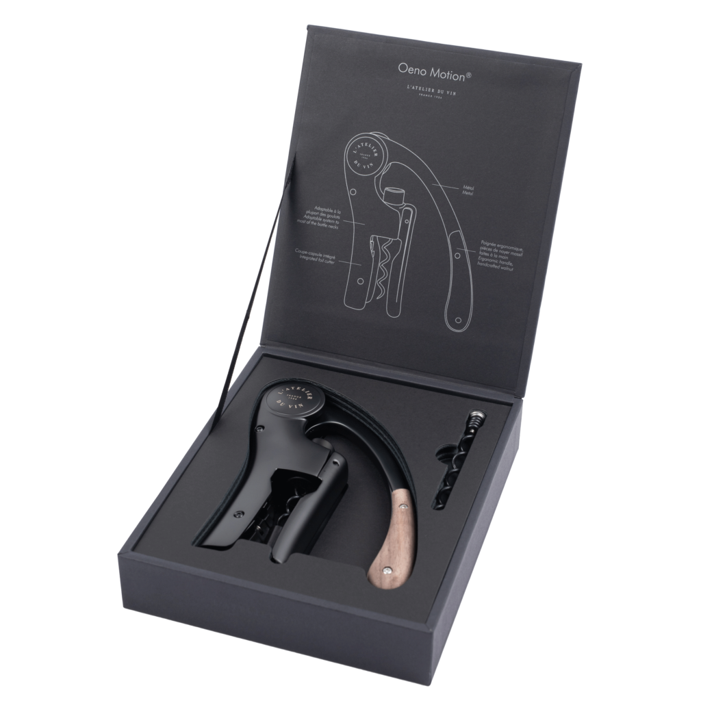 Metal and wood-clad tiger. Compact and foolproof, the Oeno Motion Wood & Black vertical lever corkscrew ensures quick and safe opening of wine bottles that cross its path. At first glance, its swaying curve highlighted by this matte black technical coating finish gives it a devastating charisma.