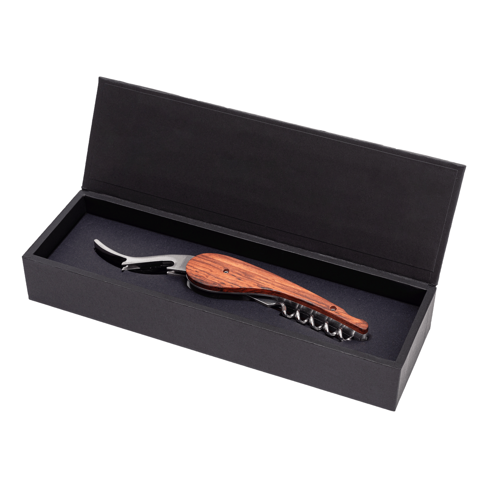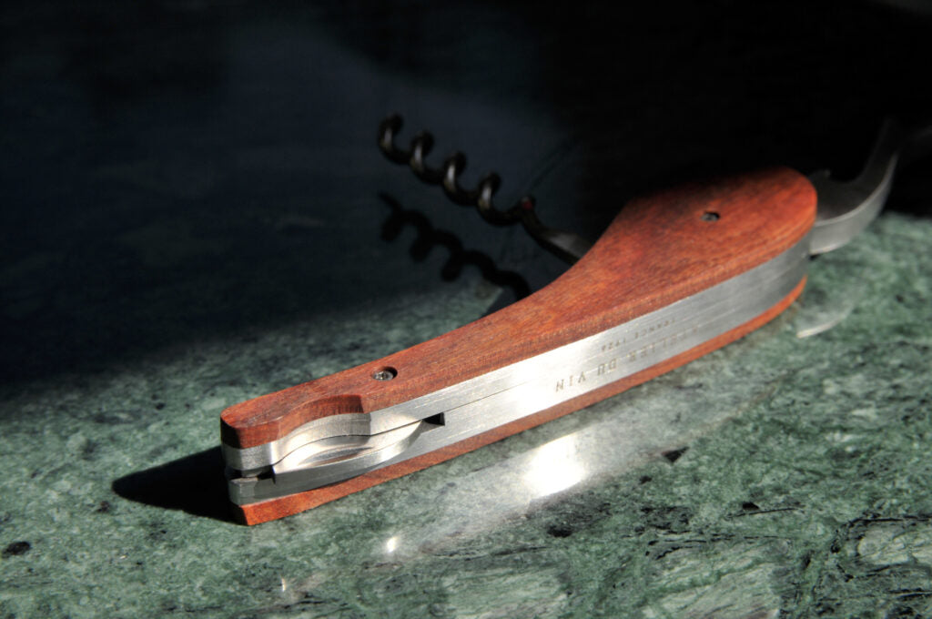 Poetic mechanism. Smooth opening. The Soft Machine ® extracts the cork in a single movement thanks to its unique rack and pinion system . Once the support lever is positioned on the neck, this ingenious gear keeps the wick in the vertical axis throughout the unblocking process. In a single fluid and continuous movement, the extraction takes place without effort or twisting of the cork, while other sommelier corkscrews require a two-step operation. On the Soft Machine ®, a foil cutter blade and a bottle opener are integrated into the handle and the toad. Researched and designed by L'Atelier du Vin, this bottle opener is assembled and finished by hand.