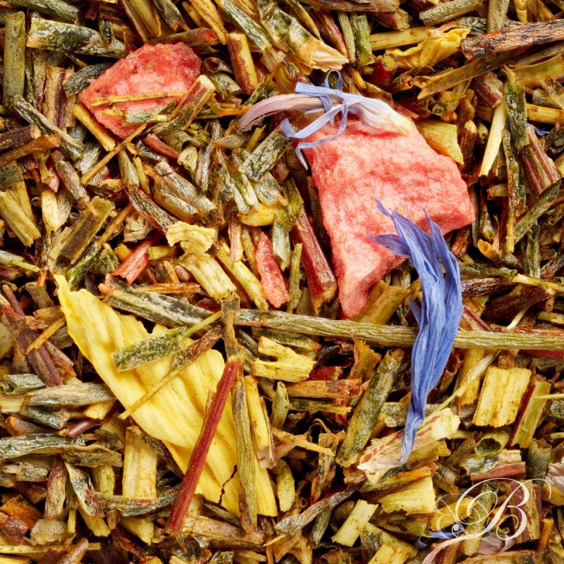 Contrairement au Rooibush rouge qui est fermenté, celui-ci est simplement séché mais non fermenté. L’infusion est donc de couleur verte pâle, avec un goût moins sucré. Ce mélange très parfumé renferme des fleurs de tournesol, le tout délicatement relevé par le parfum de la rose, fraise, vanille et pamplemousse.Vendu dans sa boîte à thé métal couleur alu brossé.