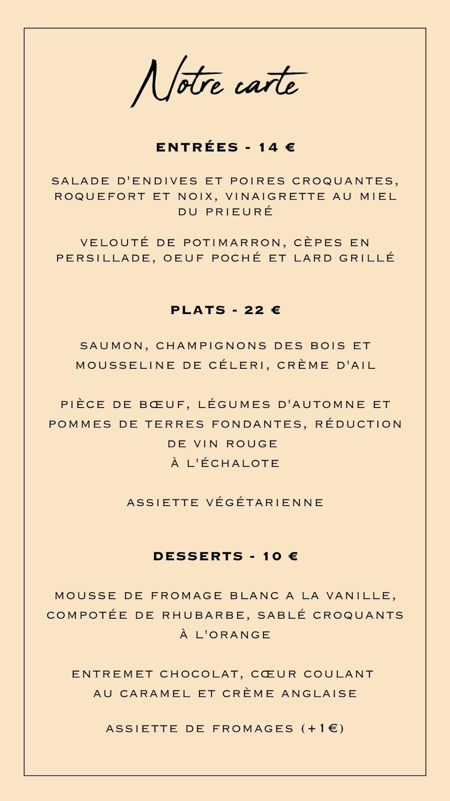 Notre carte est courte avec 2 ou 3 entrées, 2 ou 3 plats, 2 desserts, 1 menu enfant et la possibilité d'une option végétarienne.