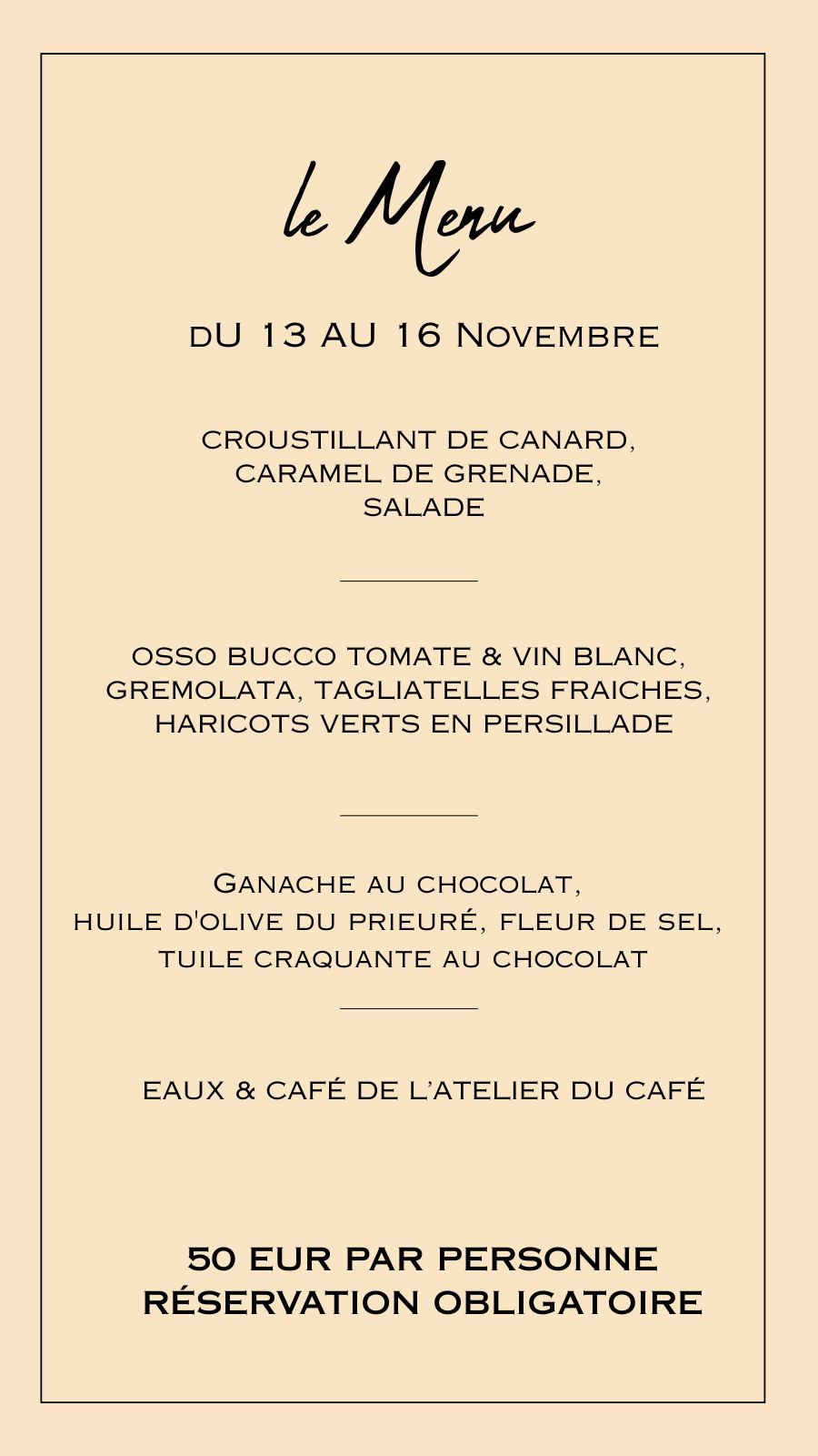 Nos grands dîners, accueillant jusqu'à 200 personnes dans le cadre unique de notre ancienne chapelle, affichent toujours complets. Nous vous proposerons bientôt de grands dîners en 2026.