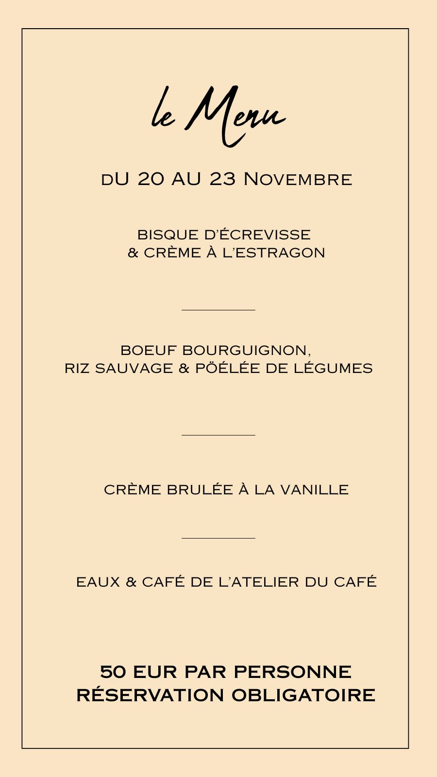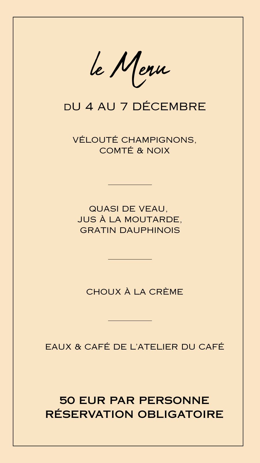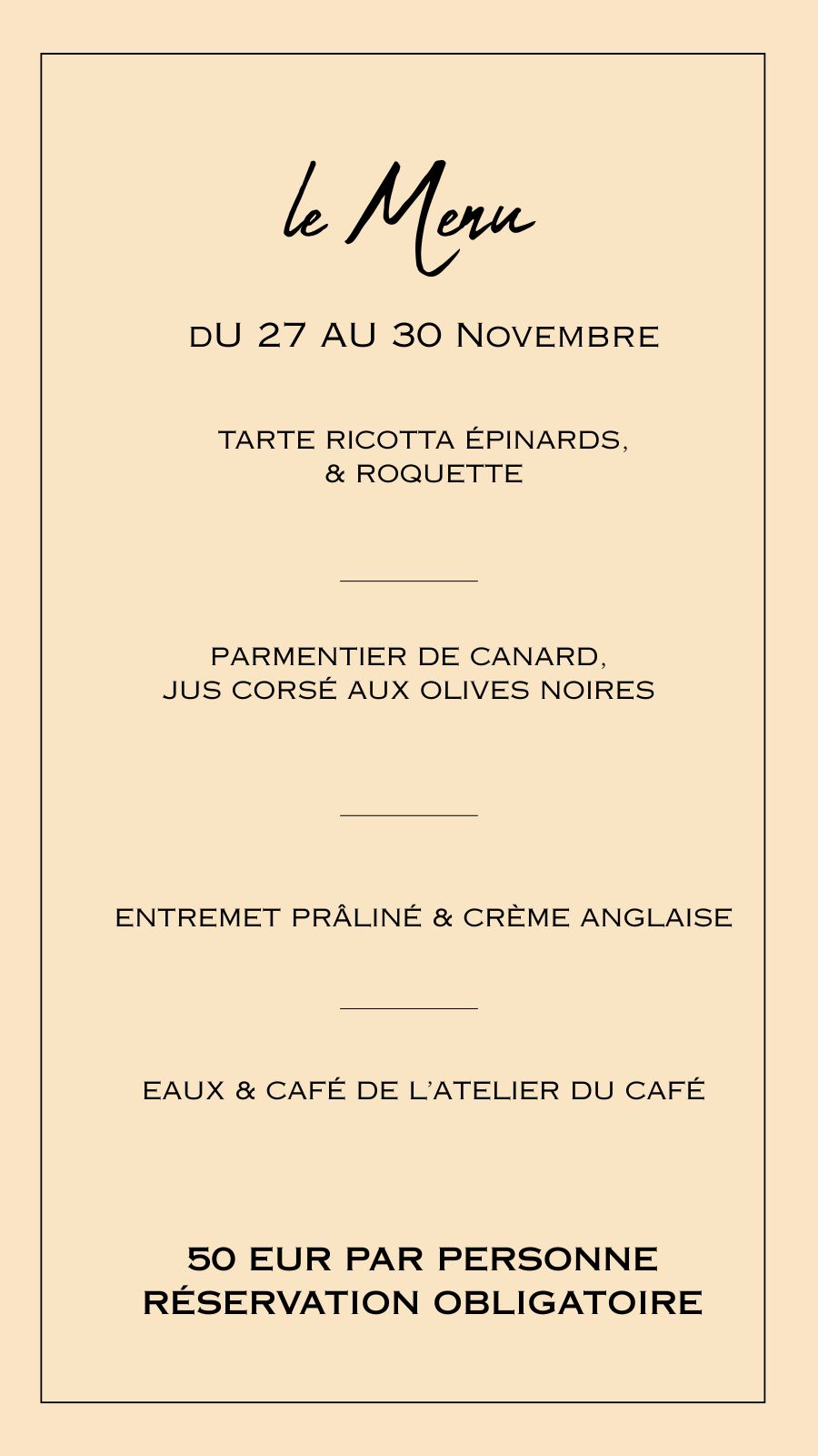 Notre carte avec un menu unique chaque semaine, 1 menu enfant et la possibilité d'une option végétarienne.