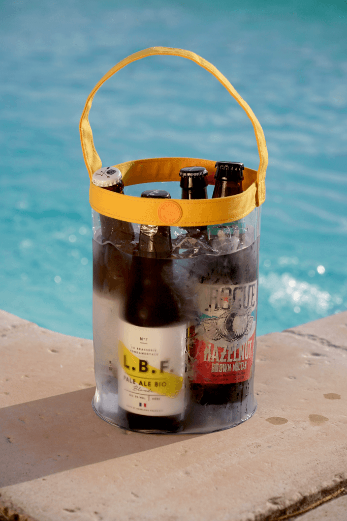 De l’eau et des glaçons dans son contenant en forme de seau et le tour est joué. Sa poignée en tissu résistant jaune lui confère sécurité et élégance et rappelle subtilement la couleur de la bière et du sunset.