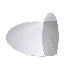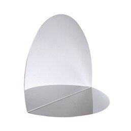 Véritable pièce d’art formée d’une feuille d’inox ovale pliée et polie à la main, Anamorphose façonne un disque d’argent dans un angle de la pièce, comme un œilleton ouvert sur un nouvel espace en mouvement. Anamorphose, de près, parce qu’il se reflète lui-même, est un idéal miroir de maquillage, en ce qu’il montre les trois dimensions du visage : sa face et ses côtés.