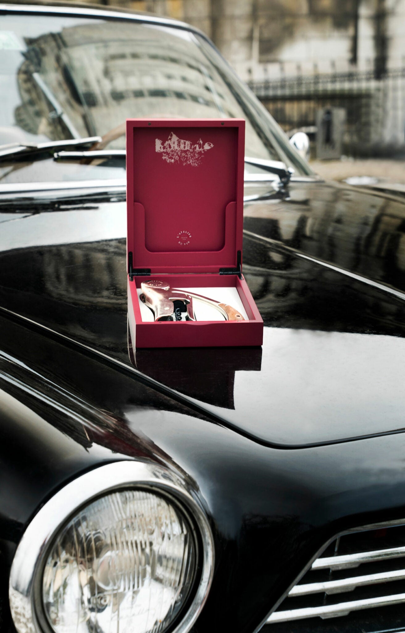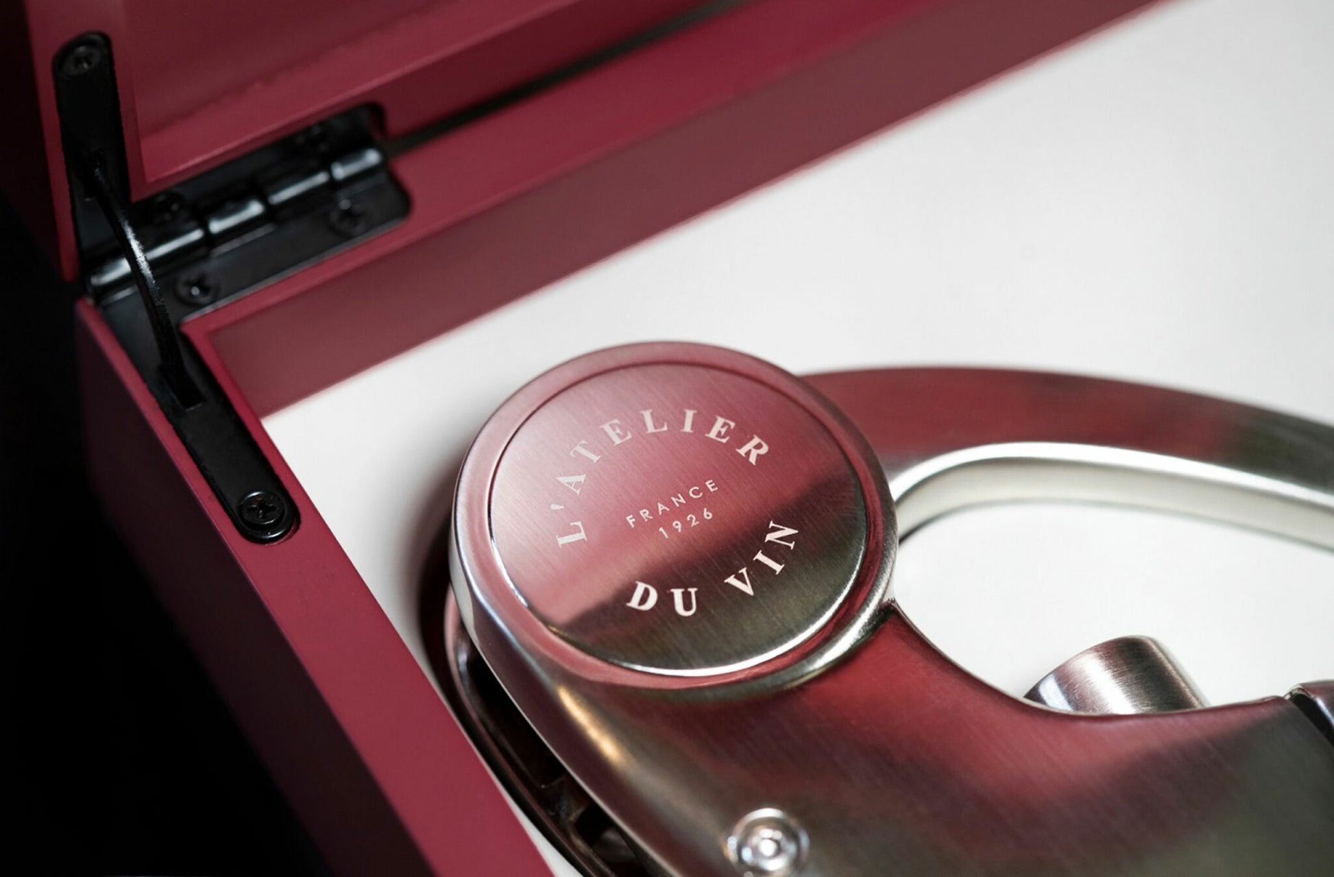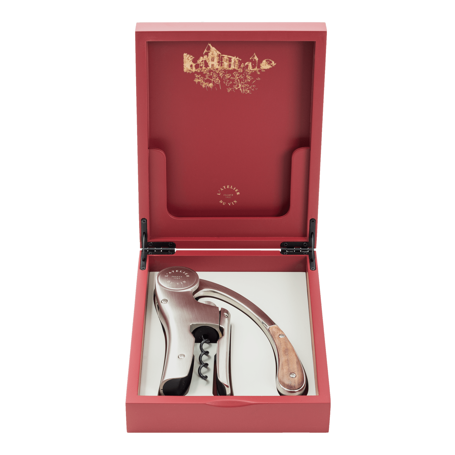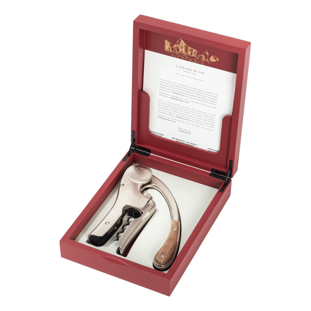 Une fois le coffret ouvert, une profonde émotion en émane soudain, lorsque se dévoile sa pièce maîtresse. Un authentique tire-bouchon à levier vertical de la collection Oeno Motion, sagement positionné dans son écrin, s’y tient prêt à ouvrir des flacons d’exception.