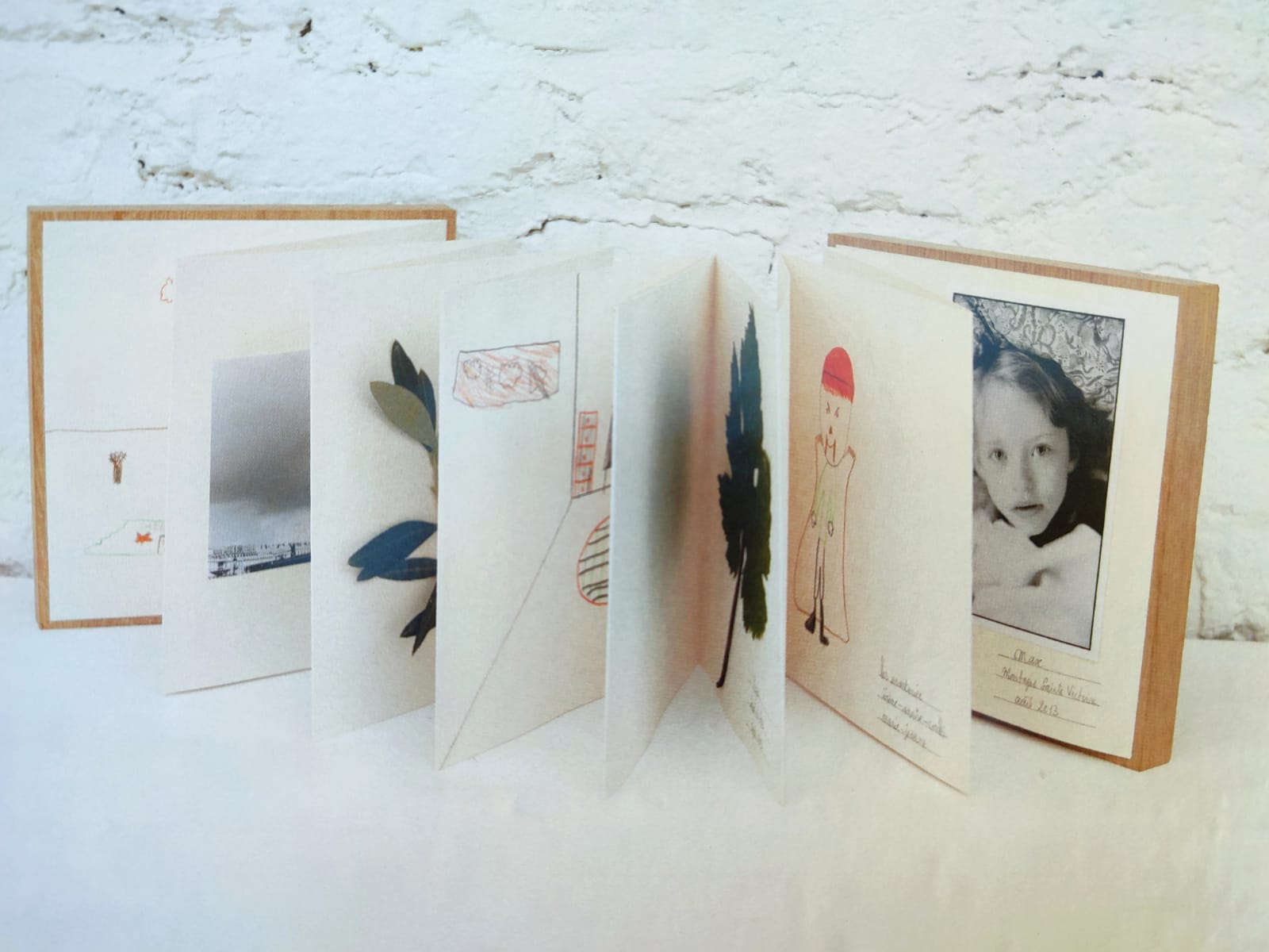 A long and thick paper accordion, enclosed between two plates of solid oak held by a thick rubber band, Portfolio is a photo album, a book for drawing and a herbarium, to display on a rack or a desk. Front: 14 pages - back: 12 pages. 21 x 21cm - Total surface of paper: 1m² Hand made in France, from solid oak, paper (300 gr) and rubber