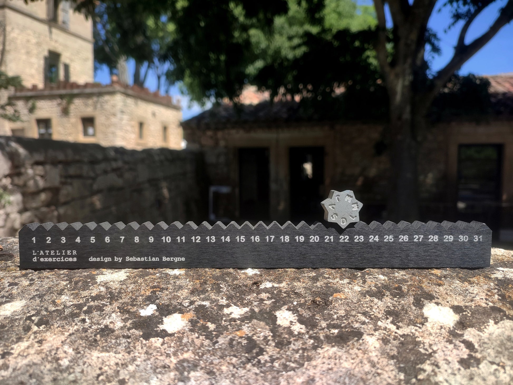 La Règle du Temps est à la fois un calendrier mensuel universel et une règle. L’étoile, positionnée sur le bord supérieur crénelé, marque le jour et la date. Faire rouler l’étoile permet de changer de jour et aussi de retrouver les dates et jours futurs du mois en cours. Les dates sont positionnées tous les centimètres : la Règle du Temps devient ainsi une règle graduée. Etoile en version bilingue : version française en recto, version anglaise en verso.