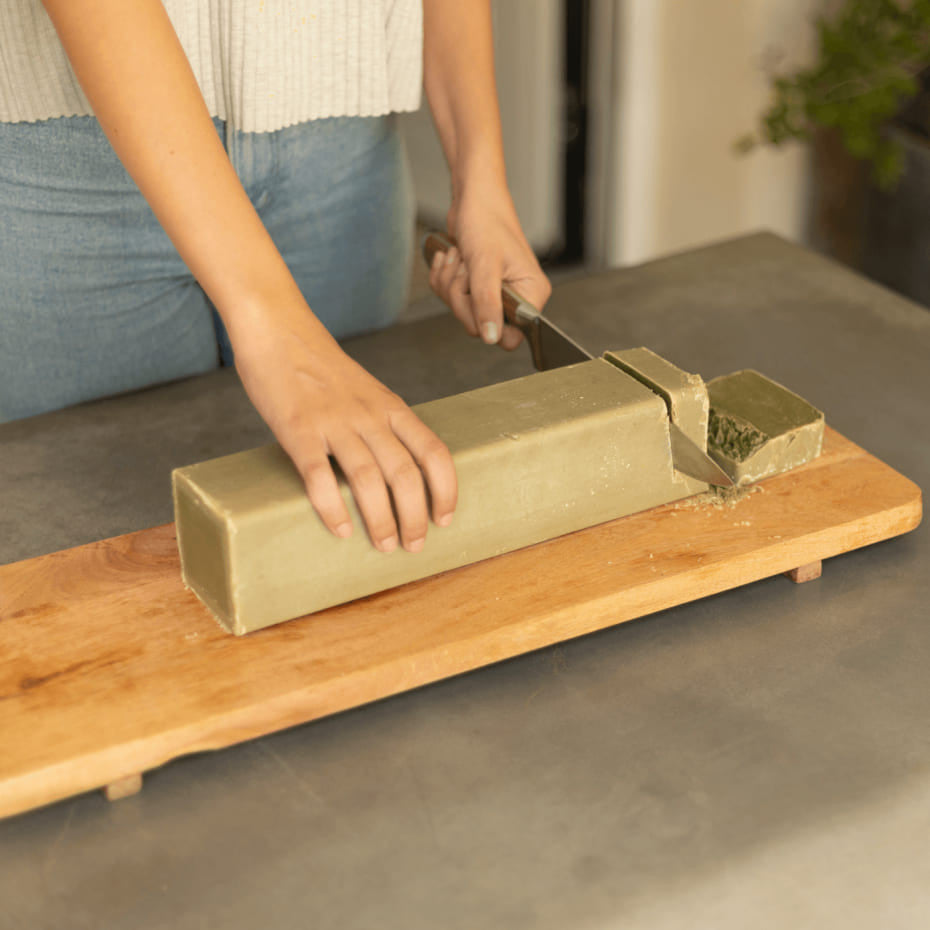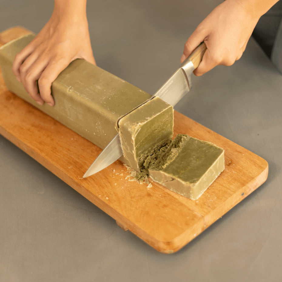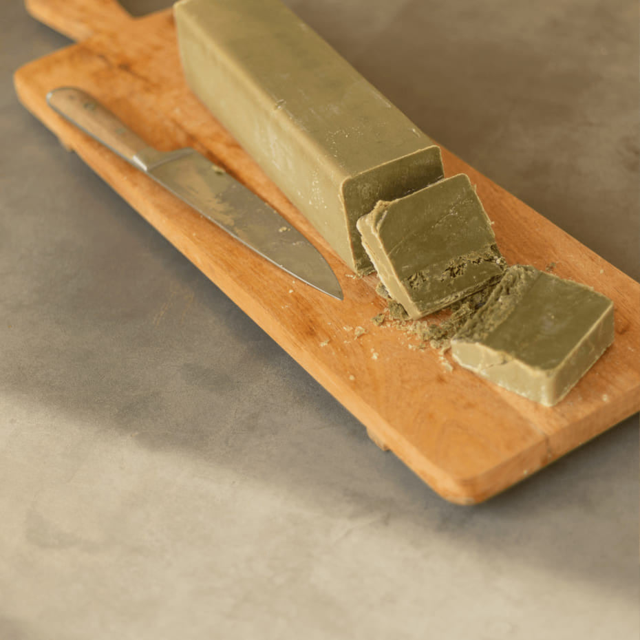 La barre de savon de Marseille est fabriquée à partir d'huiles végétales : grignons d'olive et coprah.